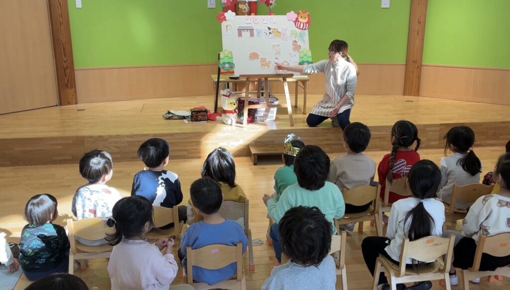 まずは1月の誕生日のお友達をお祝い。その後、『新年おめでとう会』を行いました。そこでは新年のお話、十二支の順番、おせちの由来、正月あそび、参拝についてお話がありました。子ども達も興味津々で聞き入っていました。