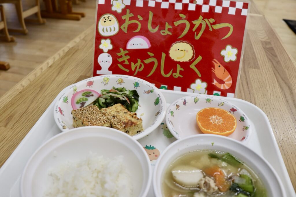 すいとん・・・お雑煮 きゅうりとカニカマの酢の物・・・なます 松風焼き 正月柄かまぼこ みかん(輪切り)・・・だいだい おやつ・・・ミニ鯛焼き