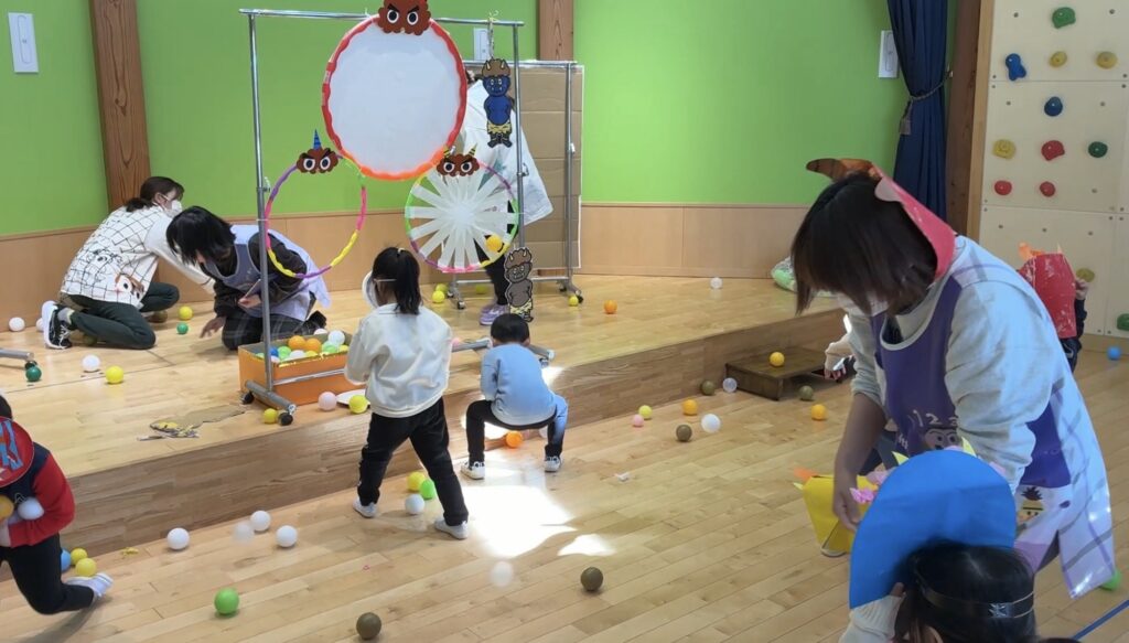 2月3日、節分豆まき会を行いました。まずはホールで2月の誕生会を行い、その後、由来説明。最後にボールを豆に見立てて、鬼退治をしました。
