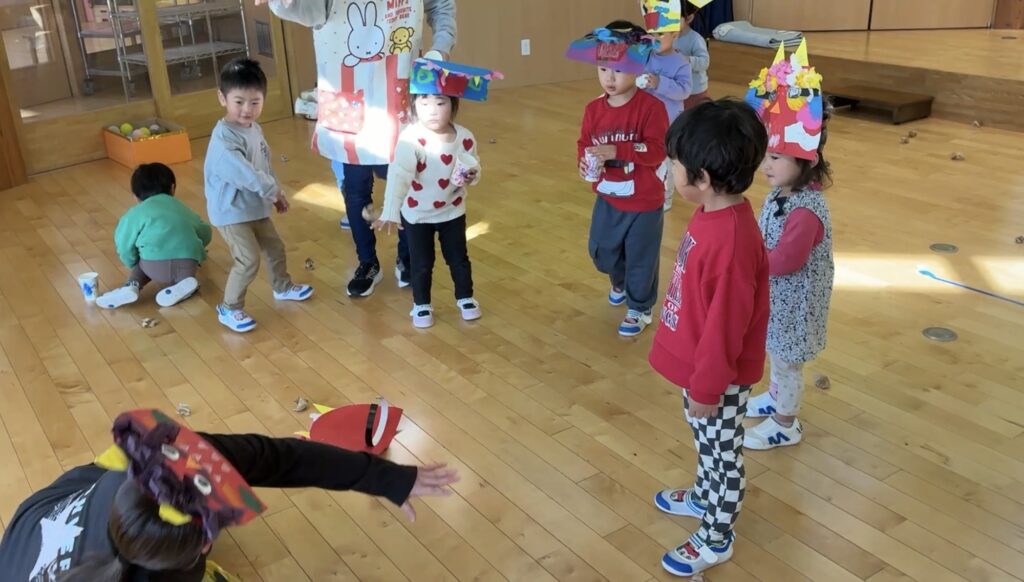 クラスに戻ってからは、それぞれ担任アレンジの豆まき会を開催。大きな鬼がいるクラスもあれば、劇仕立てに豆まきをするクラス、担任オニのクラスと様々でした。